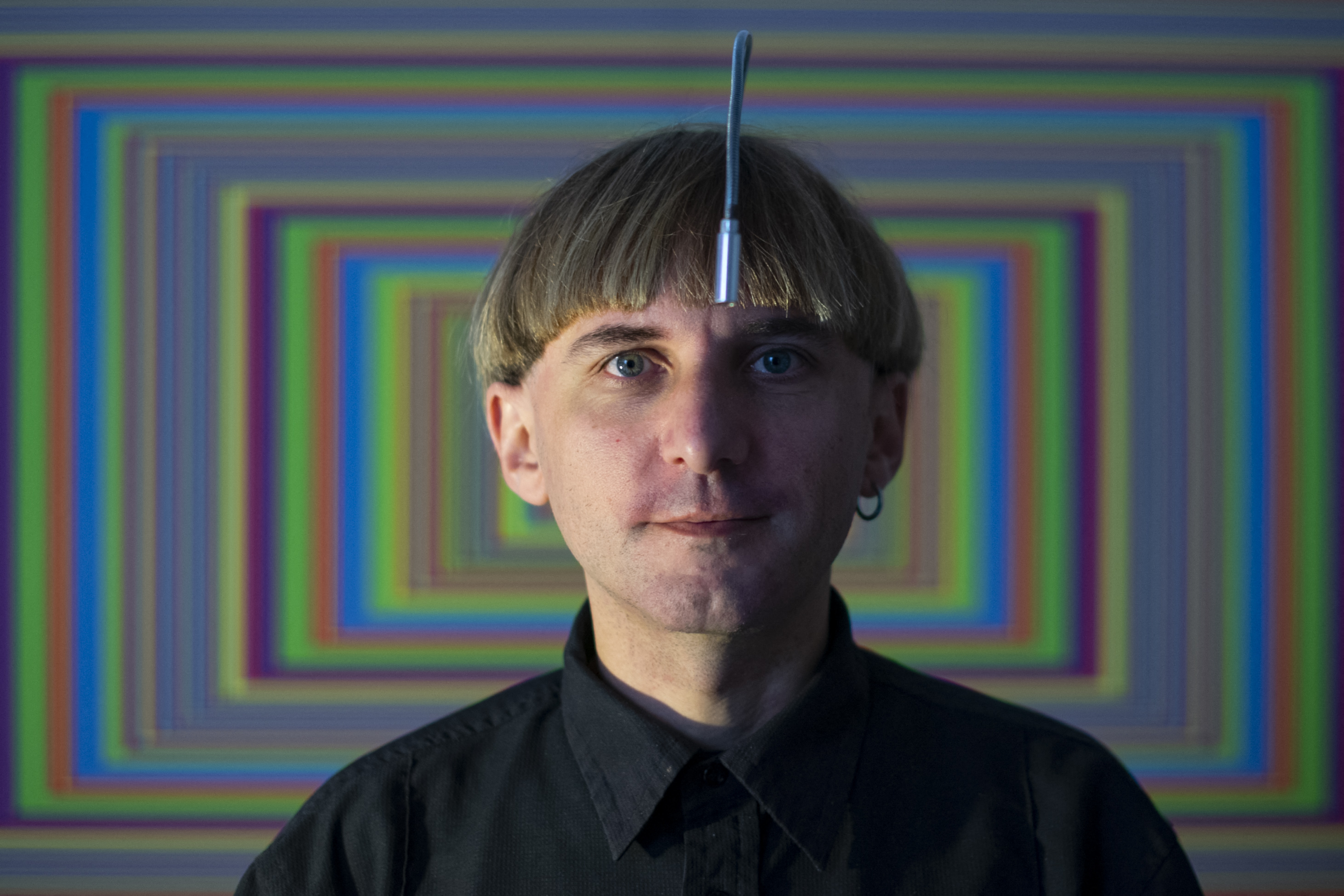 While at music college in England, he developed the slim metal rod that arches over his head and vibrates according to colours it detects.