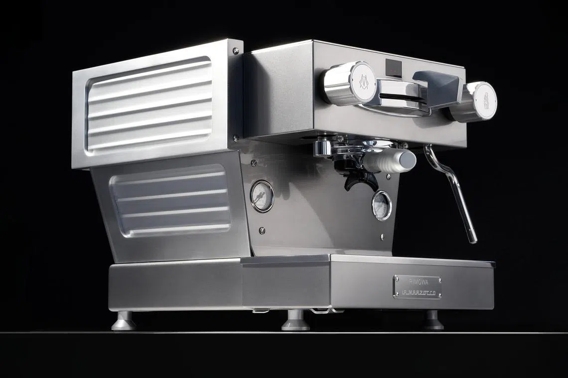 The Rimowa La Marzocco Linea Mini espresso machine features design elements like Rimowa’s signature grooved aluminium.