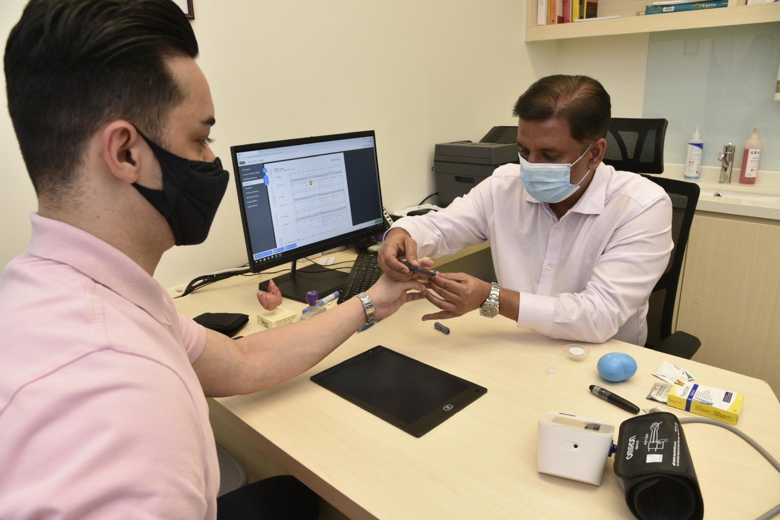 Dr Nitish Mishra doing a Glocumeter strip test check of a diabetic patient on May 12, 2021.