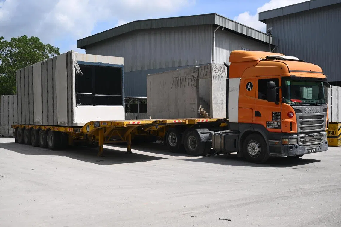 A Prefabricated Prefinished Volumetric Construction module on a Singapore-bound trailer bed at Aurum Precast in Pekan Nanas.