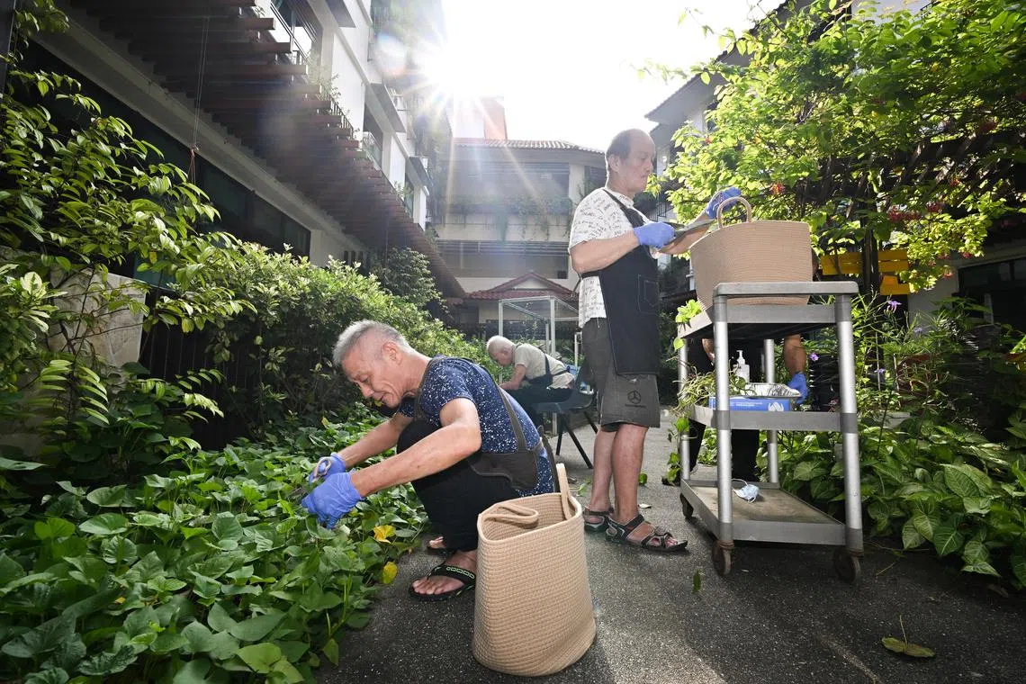 (From left) Mr Michael Tan harvesting vegetables at Apex Harmony Lodge with fellow residents Peter Lim and Tay Cheng Kuay. The lodge is a purpose-built home for people with dementia.