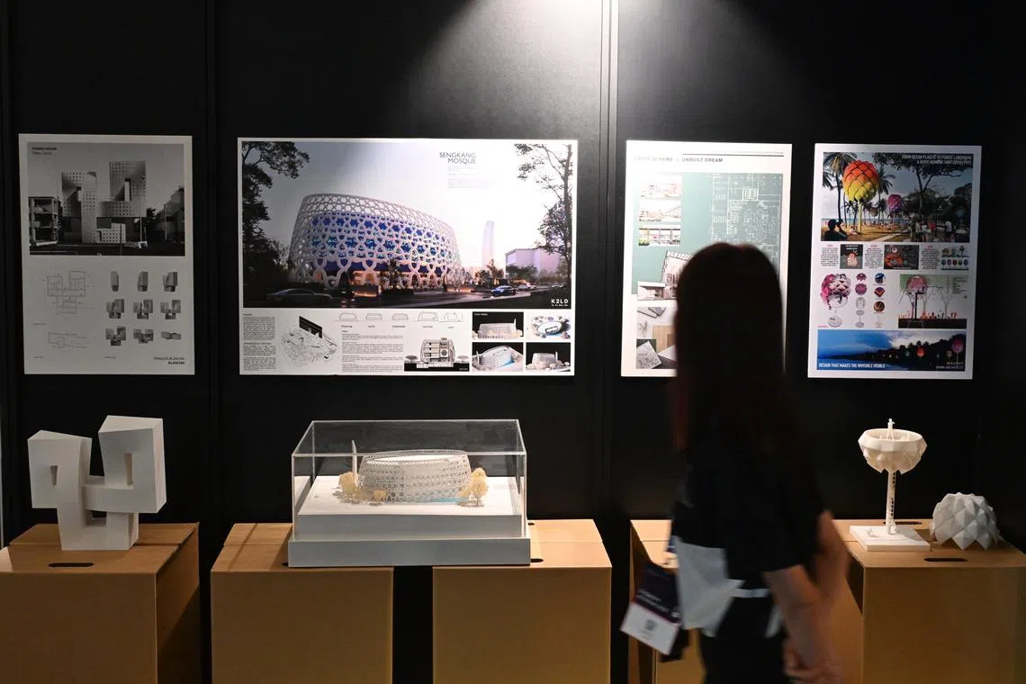 Visitors looking at a rare collection of unbuilt works by Singaporean architects on display at Singapore Archifest 2025 on June 26.