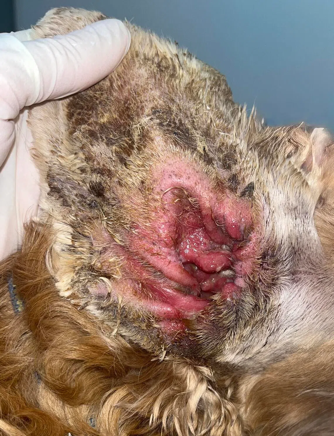 A painful case of otitis externa in a dog, characterised by the severe inflammation and tell-tale yellow-green discharge often seen with rod bacterial infections.
