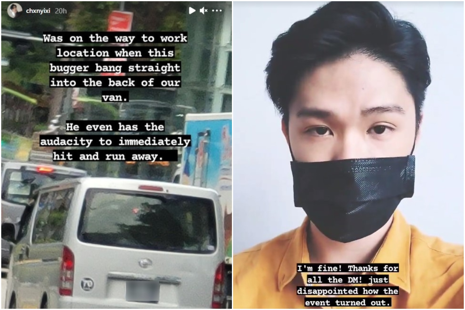 SINGAPORE - Actor Chen Yixi, 30, was the victim of a hit-and-run accident on Wednesday morning (Aug11), when the van he was in was allegedly rear-ended by another van.