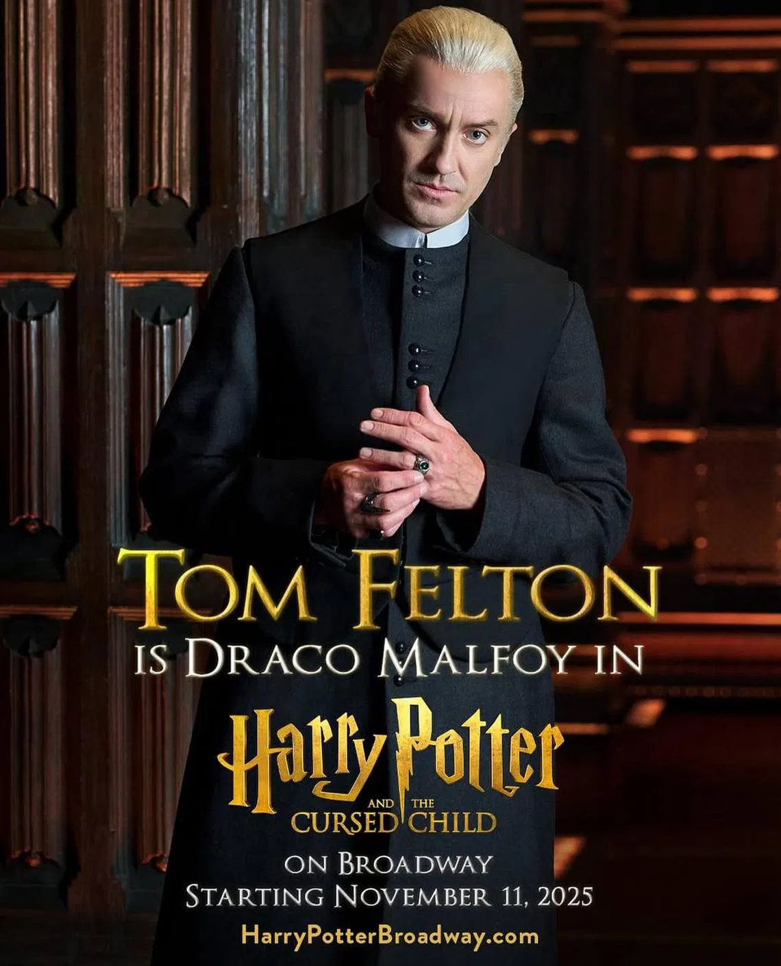NEW YORK – Tom Felton, who rose to fame as Draco Malfoy in the Harry Potter film franchise (2001 to 2011), is reprising his role as the titular boy wizard’s blond arch-nemesis on Broadway for a limited engagement beginning November.
