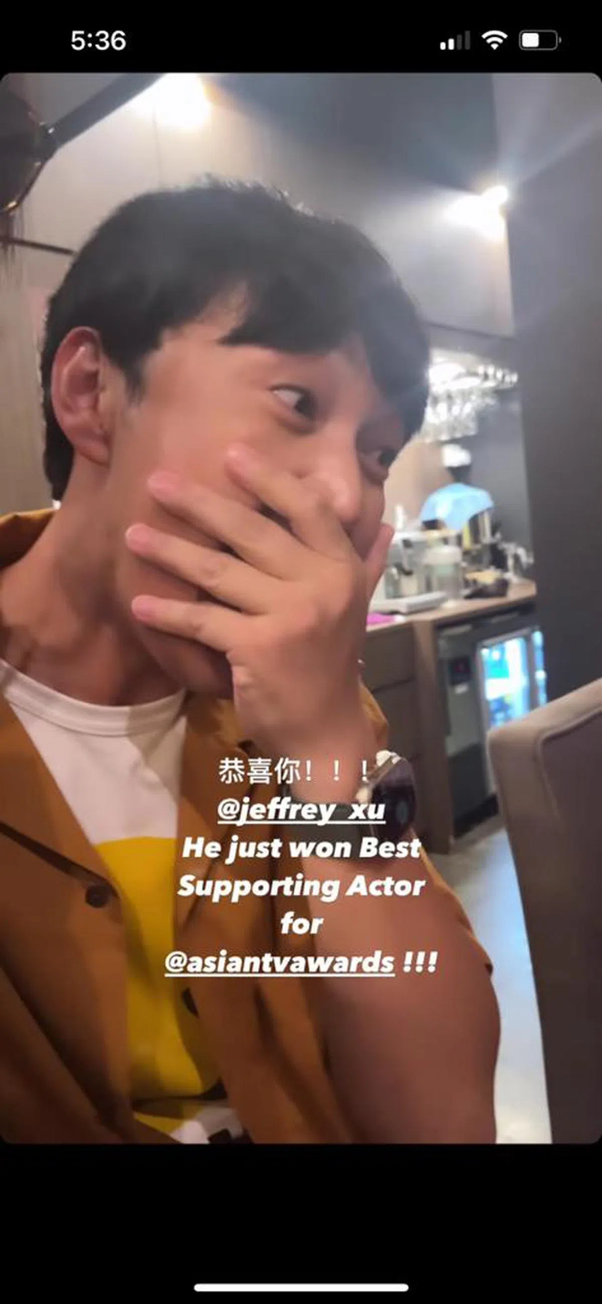 Actress Felicia Chin caught the moment husband Jeffrey Xu found out he had won the best supporting actor prize at the Asian Television Awards.