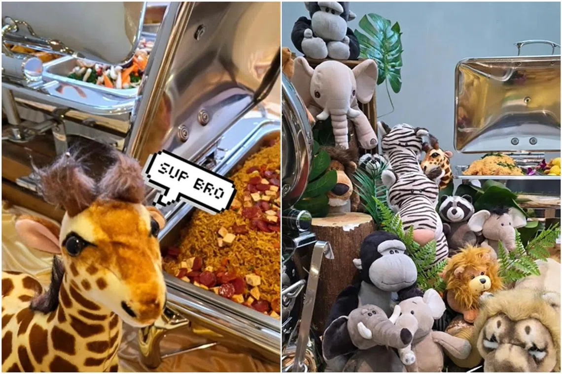 Desmond Tan shared on Instagram Stories videos of a buffet surrounded by several animal plush toys.