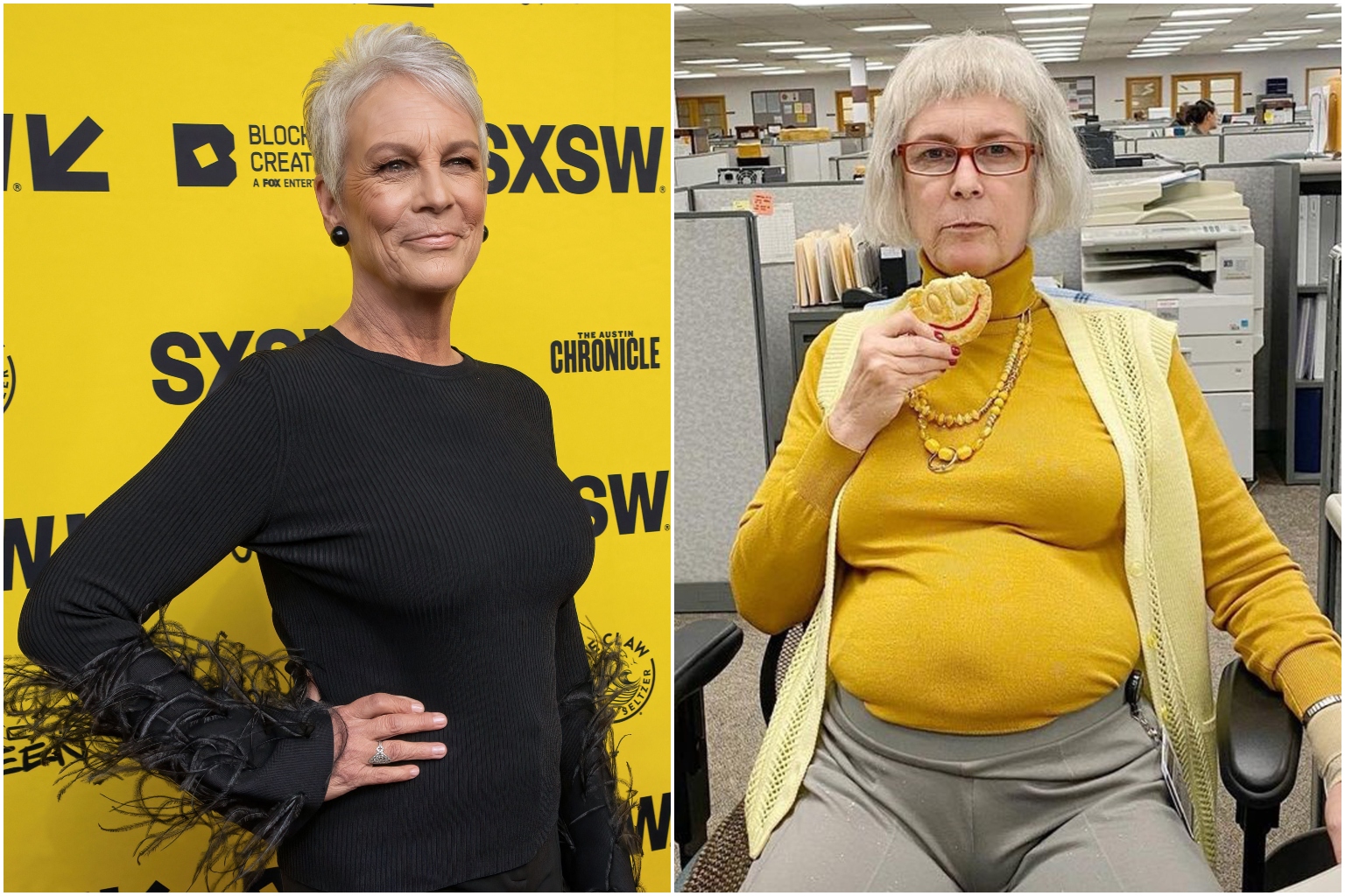 Jamie Lee Curtis did not use prosthetics for her role of Deirdre Beaubeirdra (right) in the science-fiction film Everything Everywhere All At Once.