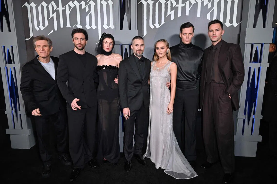Director Robert Eggers (centre) with cast members (from left) Willem Dafoe, Aaron Taylor-Johnson, Emma Corrin, Lily-Rose Depp, Bill Skarsgard and Nicholas Hoult at the Los Angeles premiere of Nosferatu in December 2024.