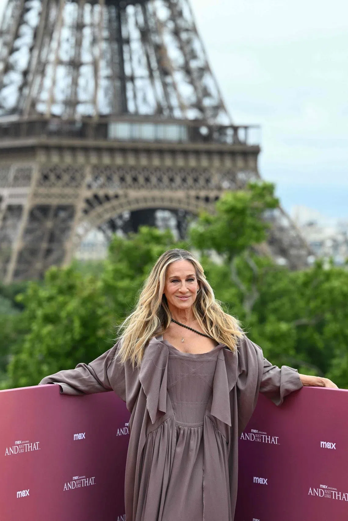 Actress Sarah Jessica Parker in front of the Eiffel Tower in Paris during a photo call for And Just Like That... in May.