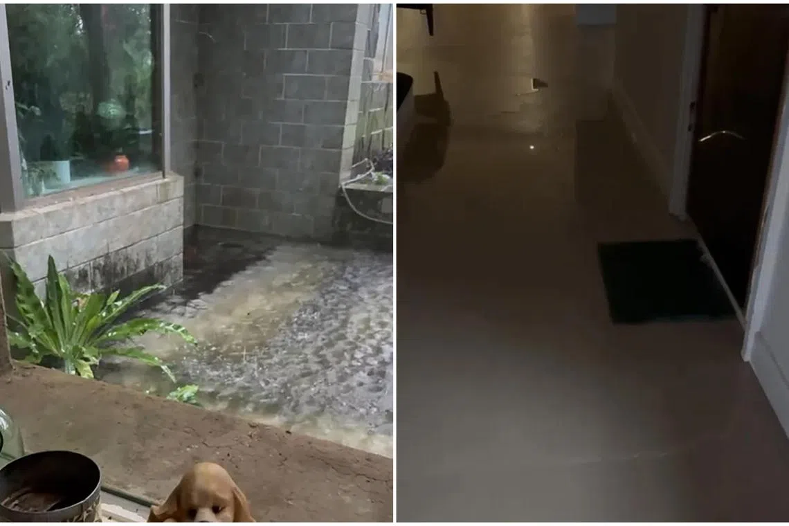Kimberley Chen posted a video of flooding outside her house (left) and water seeping into her home.