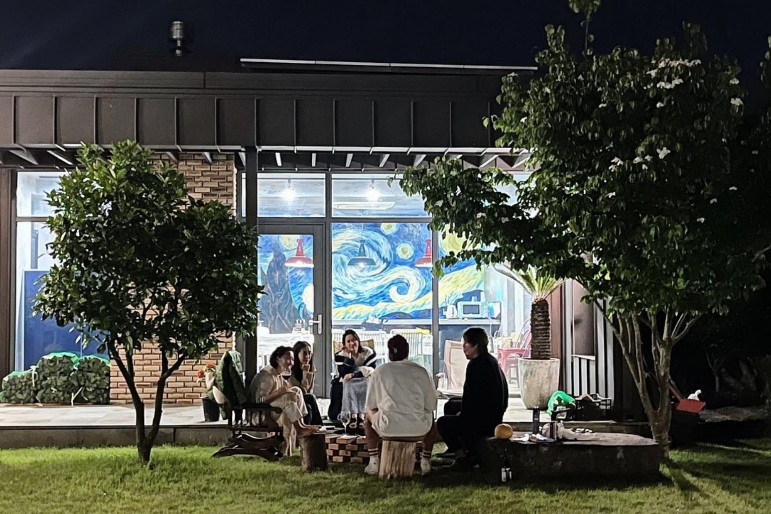 The two pictures showed a group of people sitting around a campfire talking and drinking.