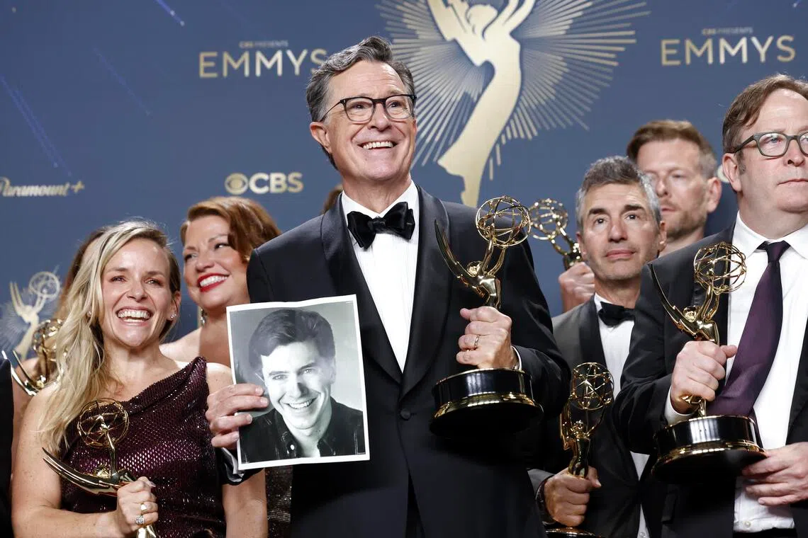 Comedian and talk show host Stephen Colbert (centre) with the best talk show award at the 77th annual Emmy Awards in Los Angeles.
