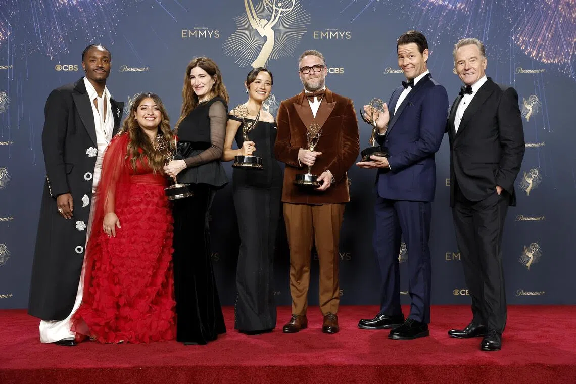 (From left) Dewayne Perkins, Keyla Monterroso Mejia, Kathryn Hahn, Chase Sui Wonders, Seth Rogen, Ike Barinholtz and Bryan Cranston during the 77th annual Emmy Awards ceremony in Los Angeles.