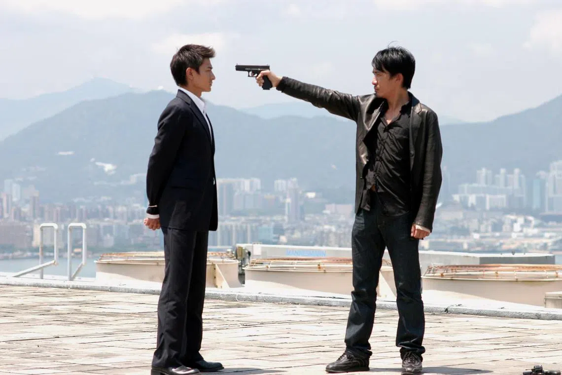 They were alluding to the iconic scene in Infernal Affairs where Lau, who played a mole in the police force, and Leung, an undercover cop in the triad world, faced off against each other in the climactic scene.