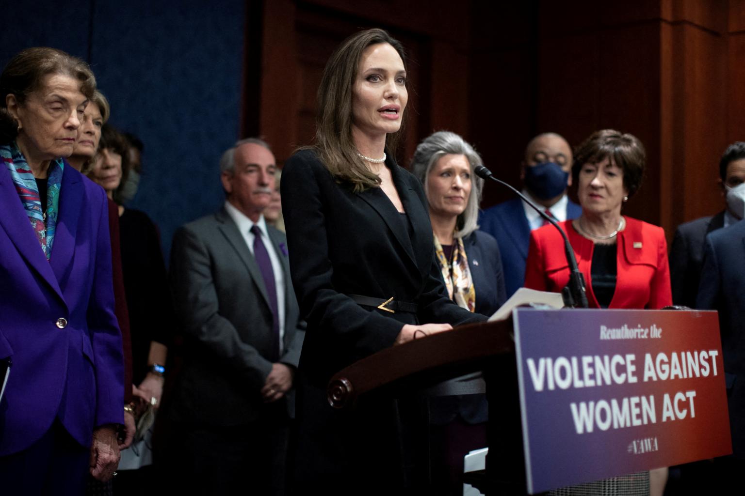 Actor Angelina Jolie speaks beside members of Congress on the Violence Against Women Act, on Capitol Hill in Washington, on Feb 9, 2022.