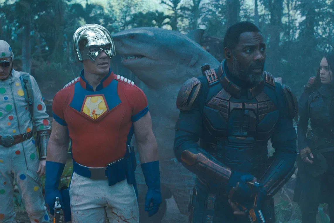 (From left) David Dastmalchian, John Cena, Sylvester Stallone (voice of King Shark), Idris Elba and Daniela Melchior in The Suicide Squad (2021).