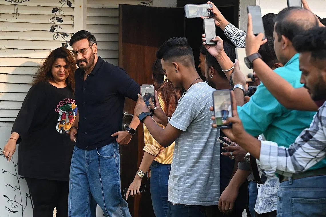 A group of paparazzi photographers take pictures and videos of Bollywood actor Ajay Devgn (second from left) at a hotel in Mumbai, on Nov 8.