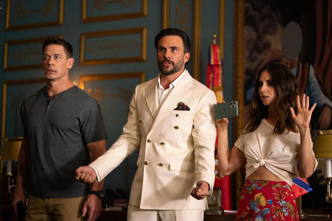 (From left) John Cena, Juan Pablo Raba and Alison Brie in Freelance.