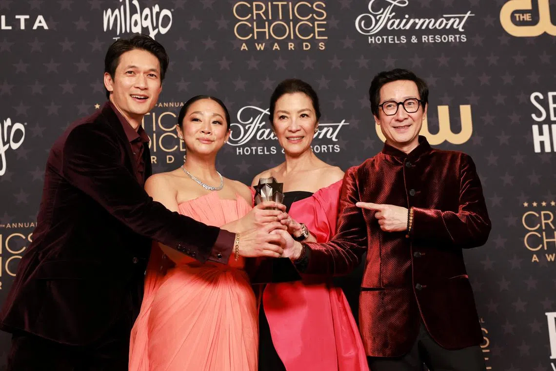(From left) Harry Shum Jr, Stephanie Hsu, Michelle Yeoh and Ke Huy Quan with the Best Picture award for Everything Everywhere All At Once at the 28th Critics Choice Awards in Los Angeles.