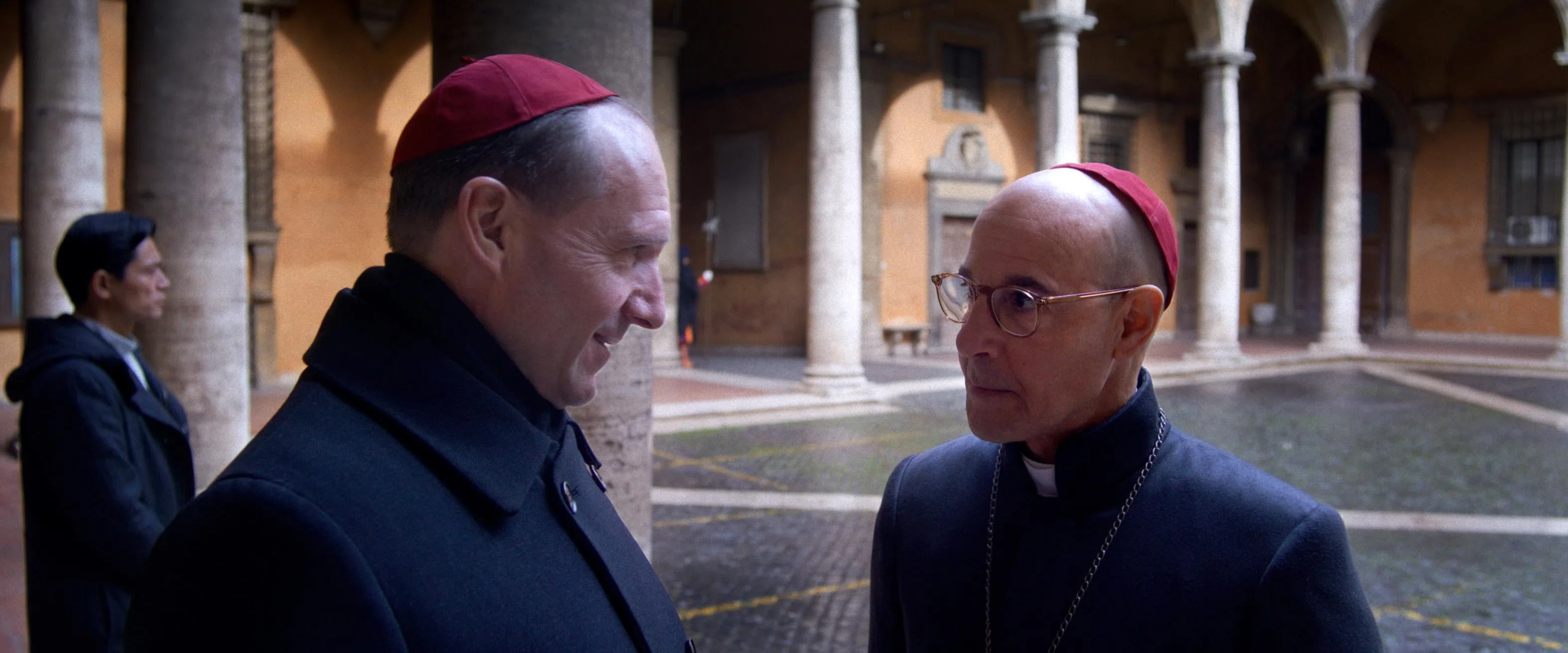 Ralph Fiennes (left) as Cardinal Lawrence and Stanley Tucci as Cardinal Bellini in Conclave.