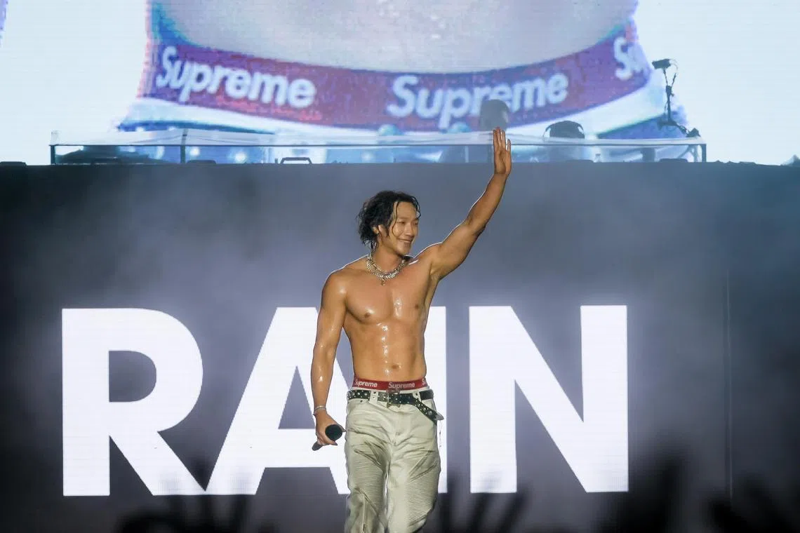 At 9.20pm, South Korean singer Rain came on in a pair of loose jeans and a floral shirt. He took off his top after just one song, to reveal the red band of his Supreme-brand underwear, while rocking some sultry dance moves.