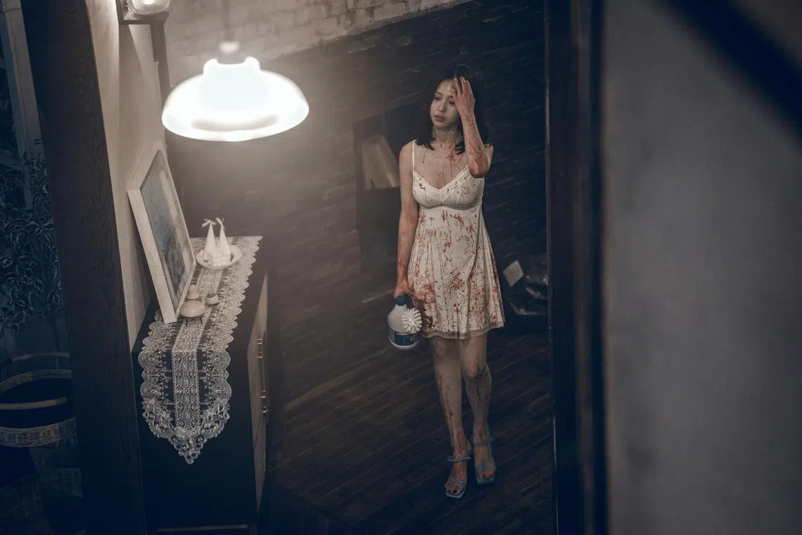 In the present day, focus is given to the beautiful decor and bright hues of Yeong-ha’s vacation rental, as well as the vibrant, fashionable clothes Seong-a wears. It makes for striking images – like when her sexy white nightdress is splattered with blood as she walks around the rustic vacation house.
