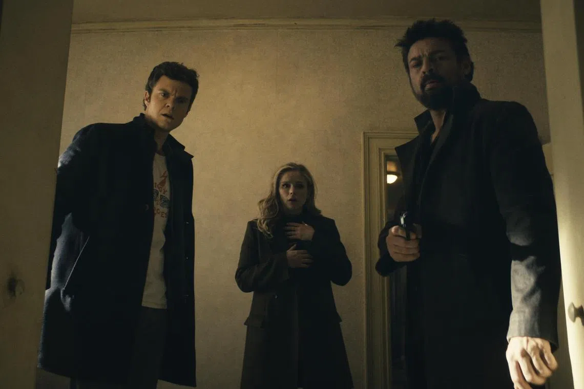 (From left) Jack Quaid, Erin Moriarty and Karl Urban in The Boys.