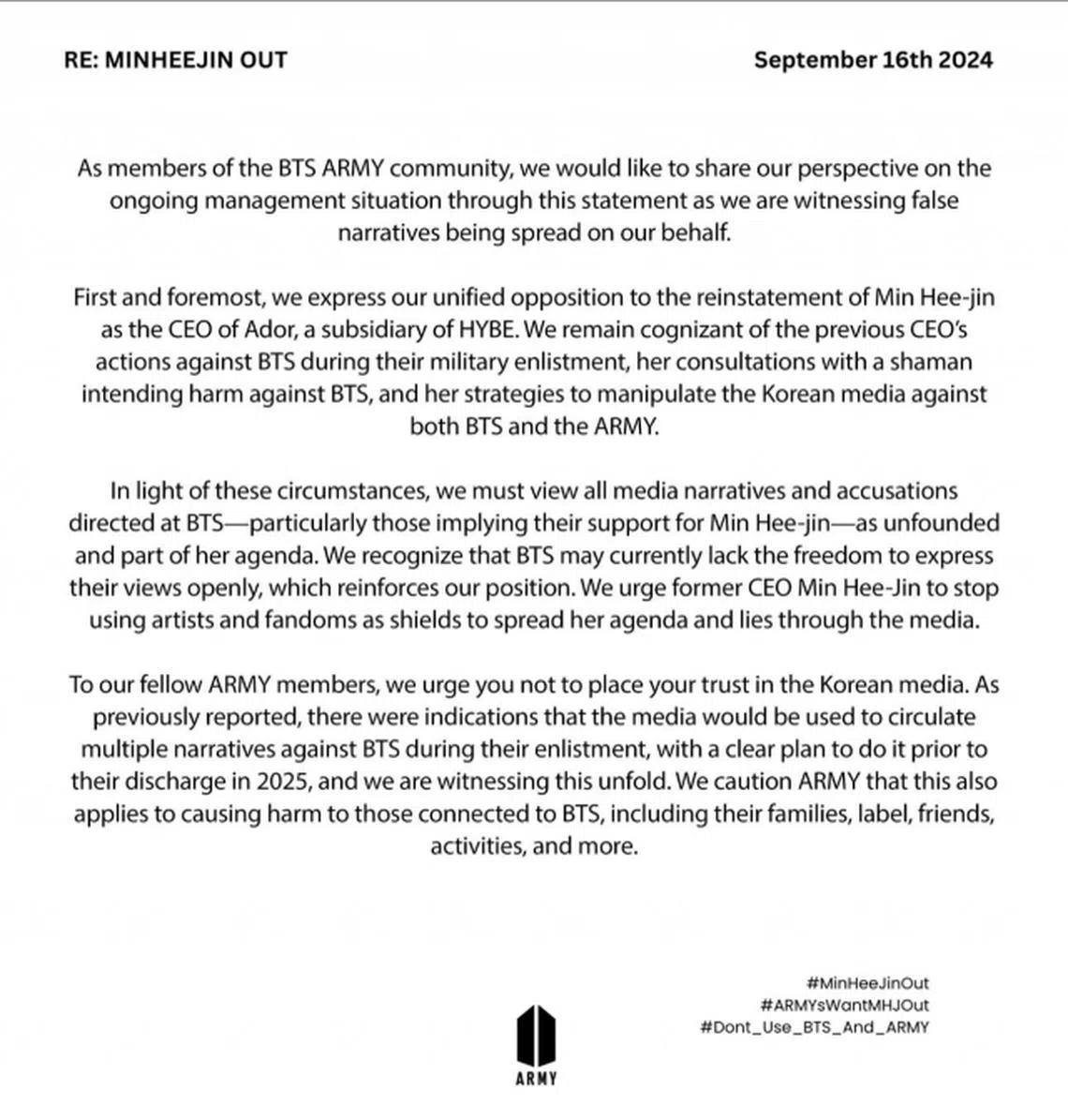 On Sept 16, a group identifying itself as part of the BTS Army community released a statement on X, expressing its unified stance against Min’s return as the CEO of Ador, a subsidiary of BTS’ agency Hybe. The group made clear that it opposes her reinstatement in a leadership role.