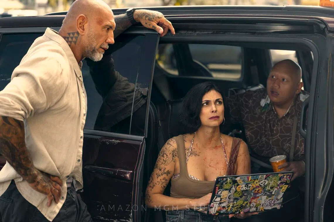 (From left) Dave Bautista, Morena Baccarin and Jacob Batalon in The Wrecking Crew.