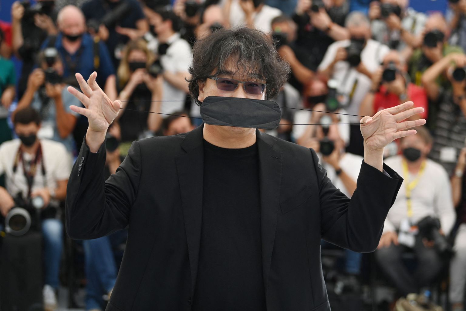 South Korean director Bong Joon-Ho plays with his face mask during a photocall for the Rendez-Vous With, in Cannes, on July 7, 2021.