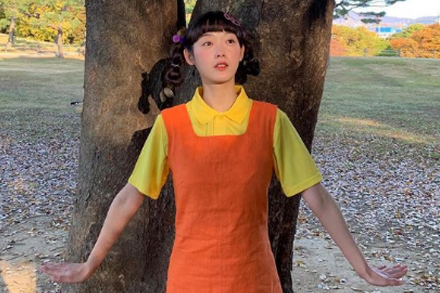 Lee Yoo-mi dressed up as the creepy mechanical doll from the show's Red Light, Green Light game.