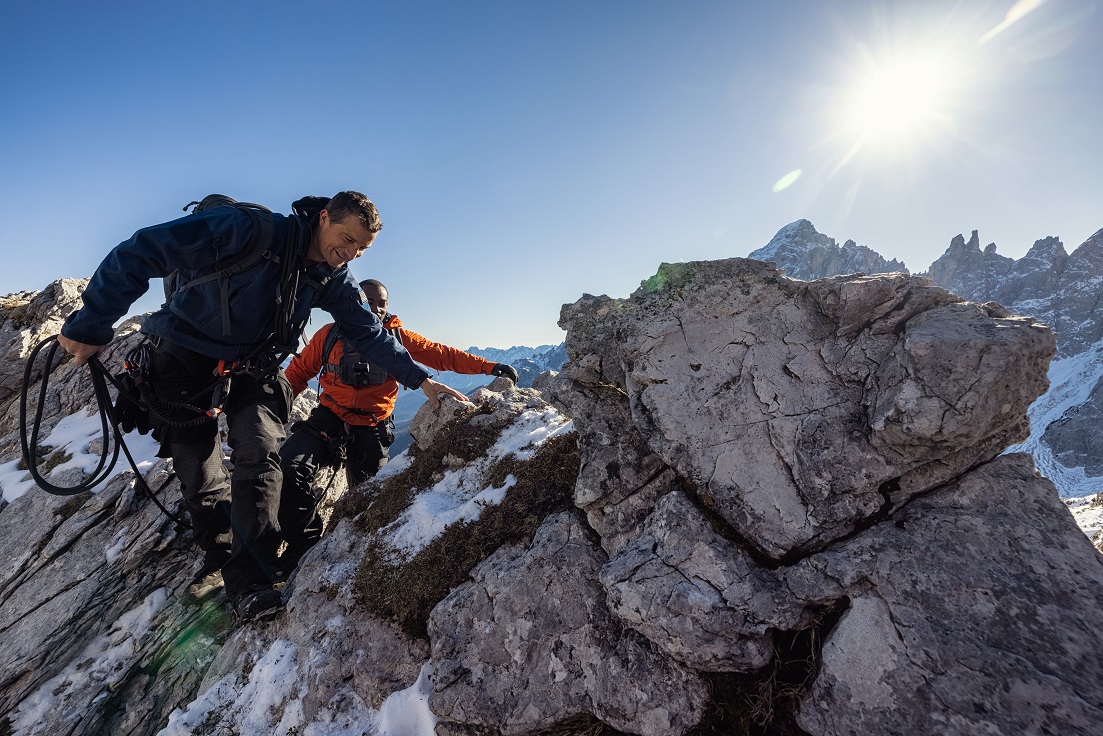 In the new season of Running With Bear Grylls, the survivalist host (left) puts Marvel star Anthony Mackie (in the background) through his paces in the rugged Italian Dolomites.