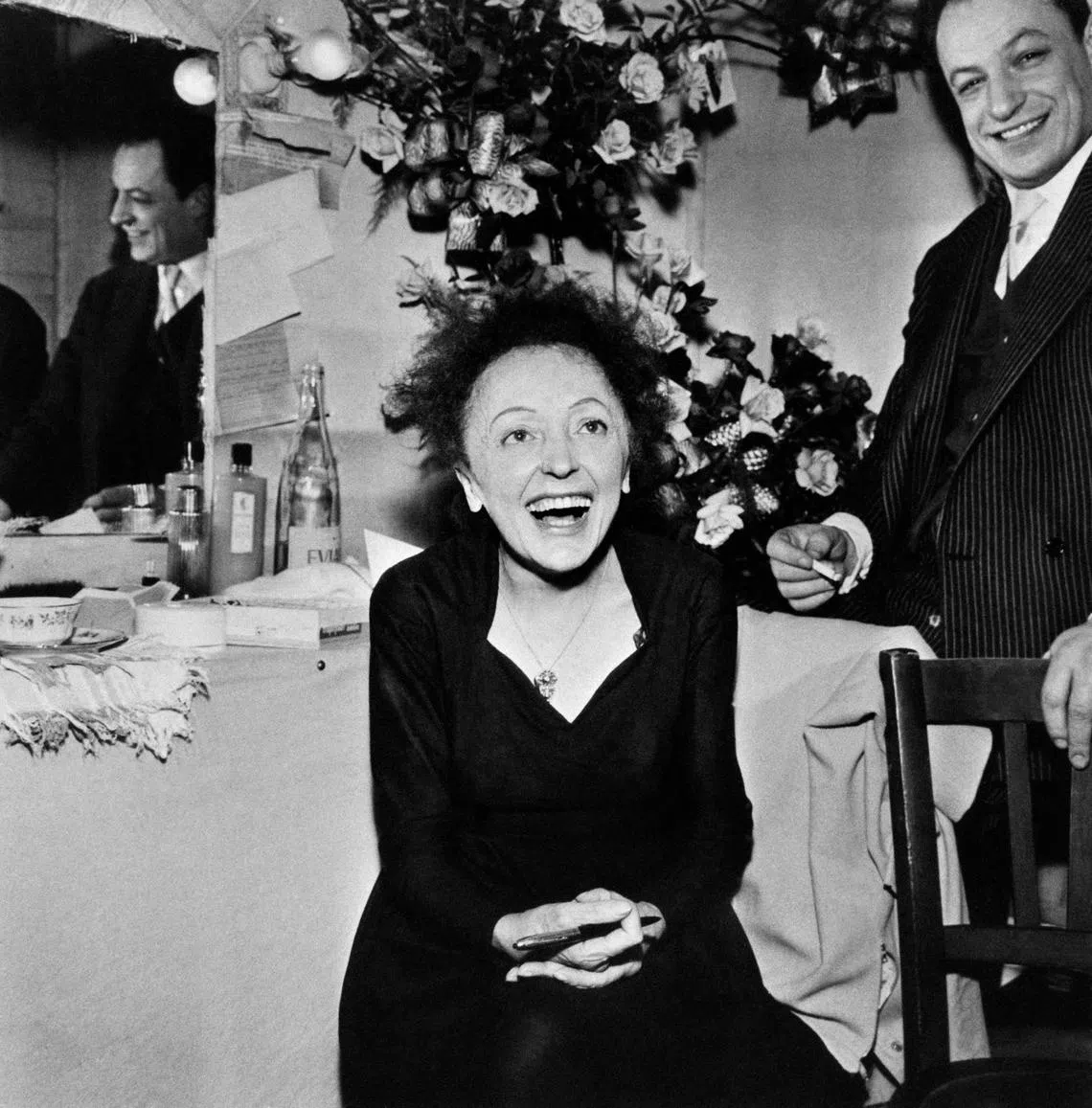 French singer Edith Piaf smiles after her show at Olympia concert hall beside her lyrics writer Charles Dumont (right) in Paris on Dec 30, 1960.