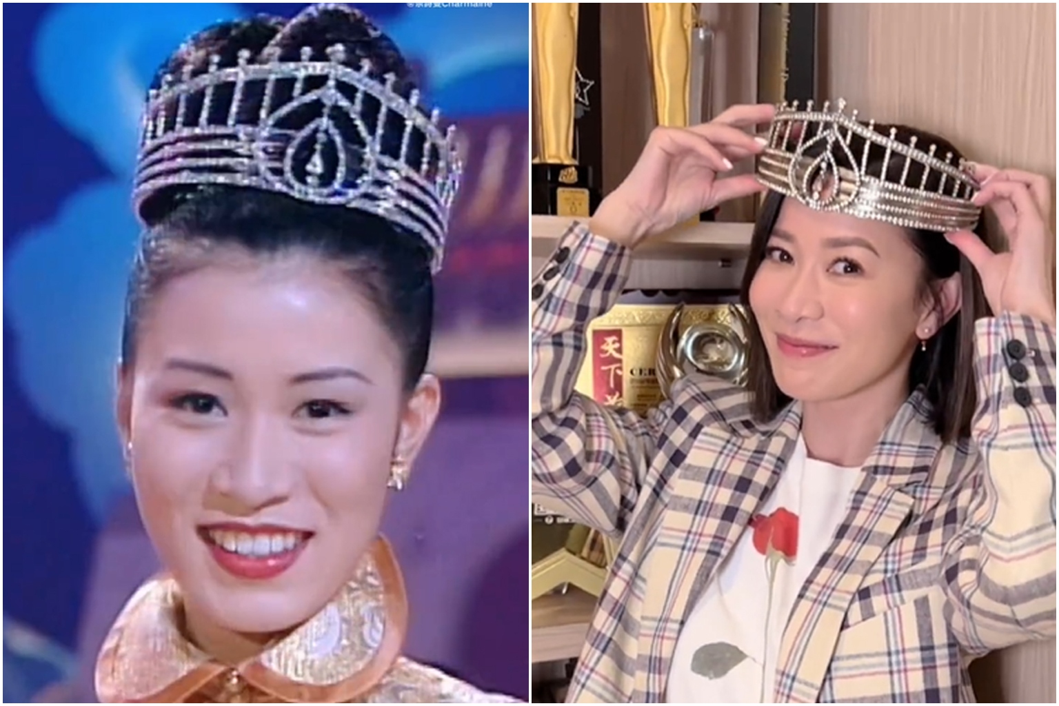 Hong Kong actress Charmaine Sheh put on the crown she had worn in the Miss Hong Kong pageant 25 years ago.