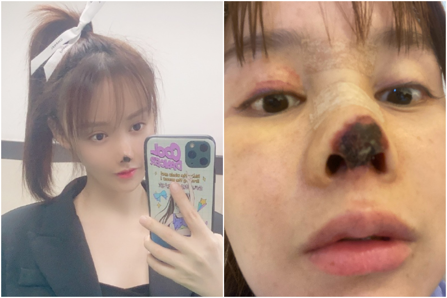 Photos she posted of her face show a clear patch of blackened flesh on the tip of her nose, as well as bandages and bruising.