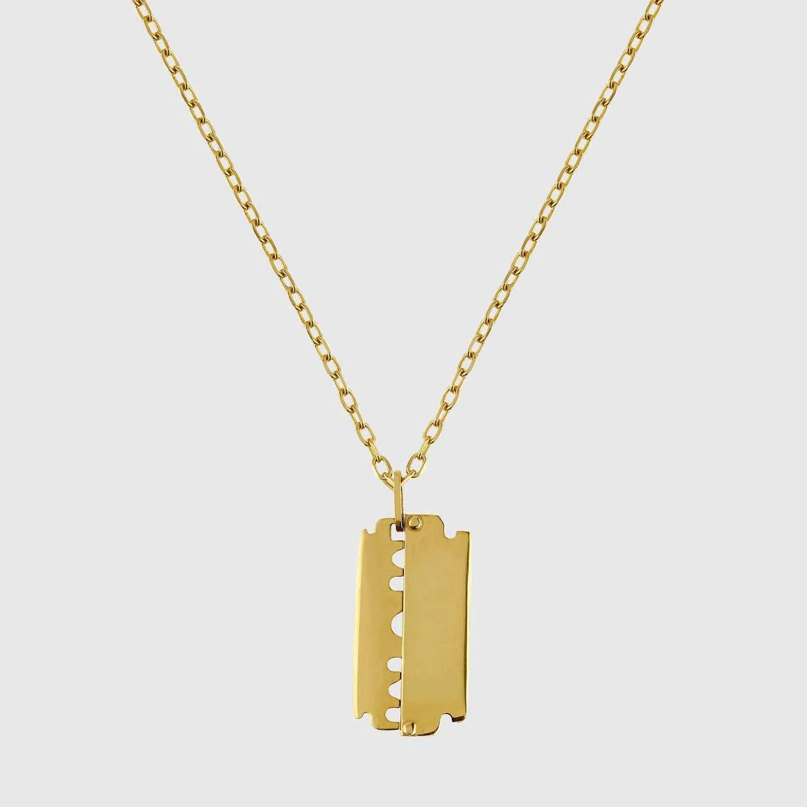 A gold razor dog tag pendant that is part of the Applied Art Forms x Hannah Martin A Vanitas jewellery collaboration.