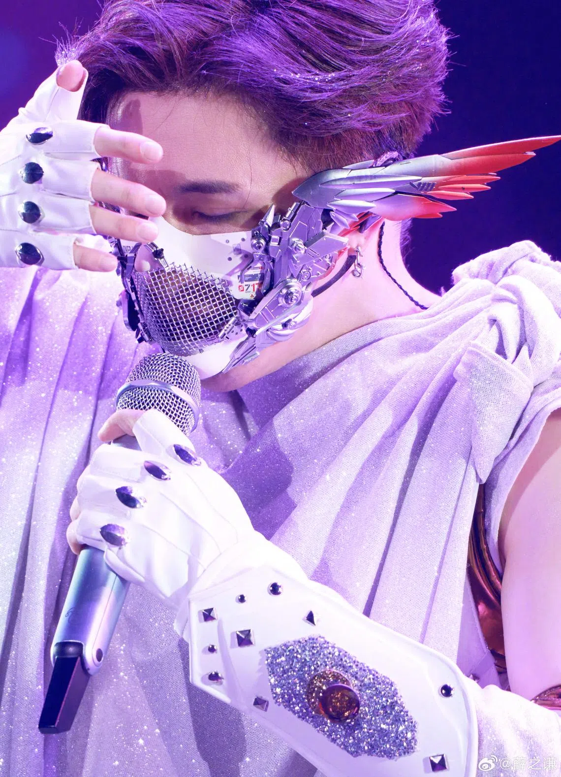 Chinese singer Joker Xue wearing a mask ornamented with wings during the song Ambition (2020) at one of his two concerts in February.