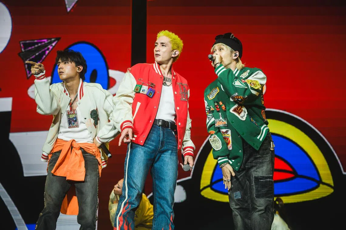 Mirror member Alton Wong (centre, in foreground) was cool and collected in a beanie and sunglasses during the concert. He is pictured here with fellow members Lokman Yeung (left) and Anson Kong (right).