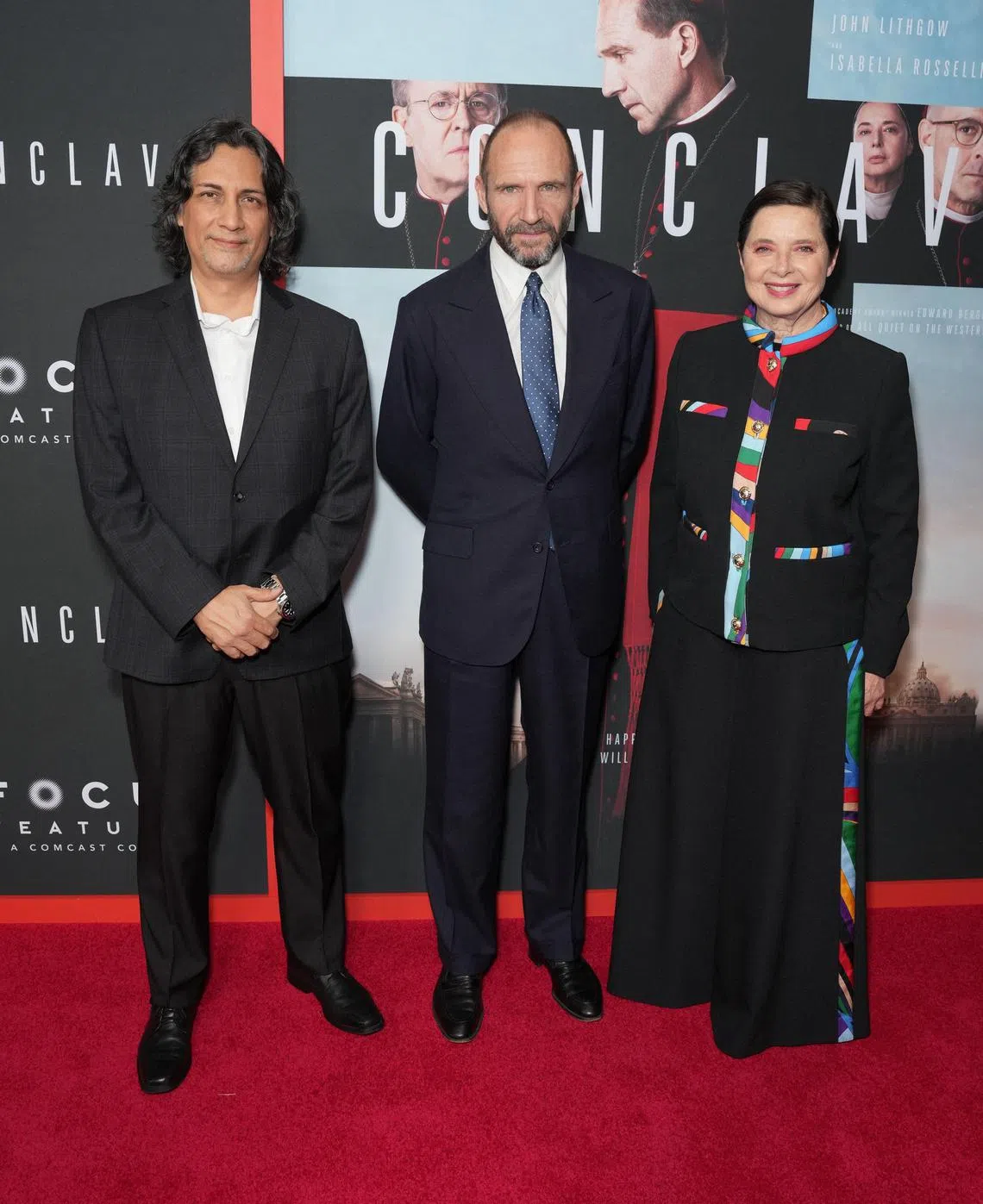 (From left) Conclave stars Carlos Diehz, Ralph Fiennes and Isabella Rossellini at the film’s New York City premiere.