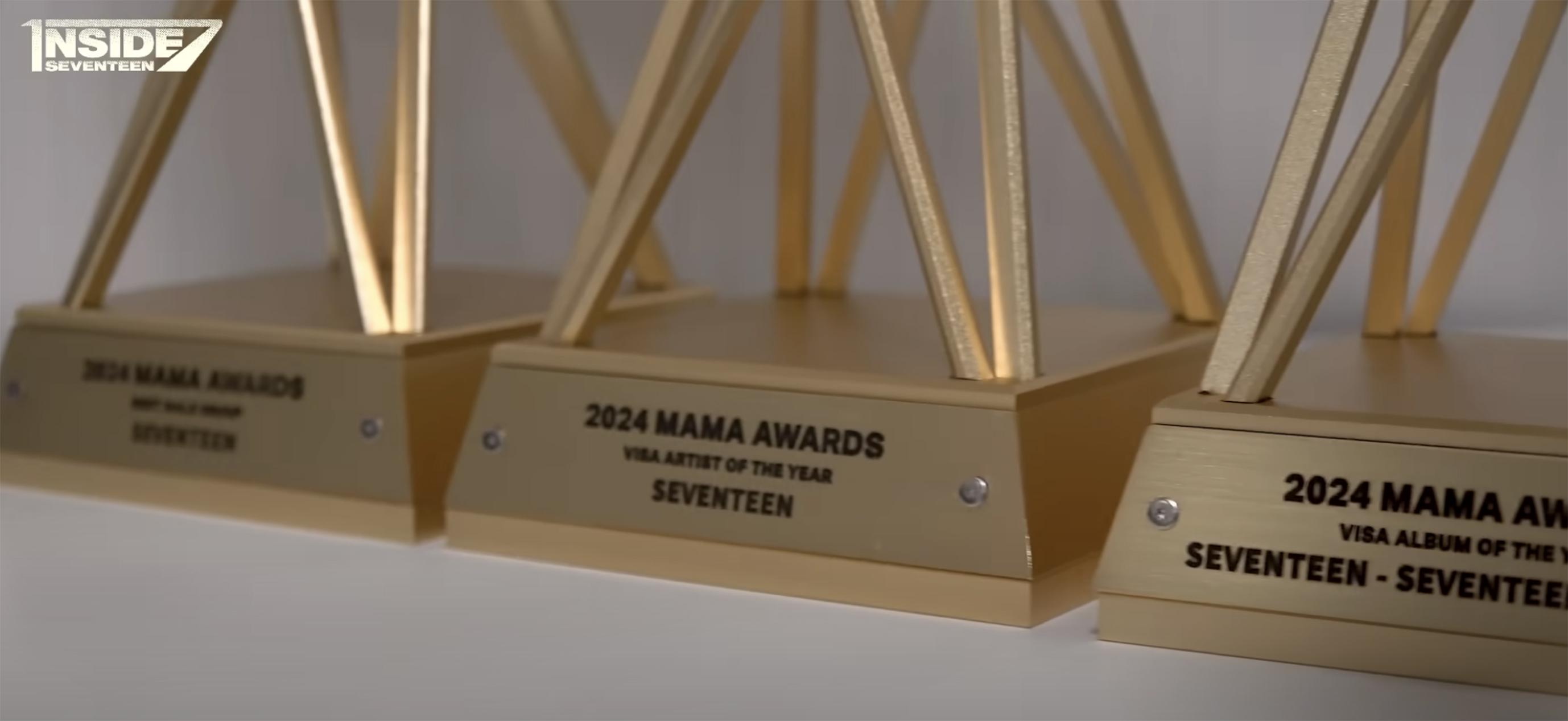 A close-up of the daesang, or grand prize, trophies Seventeen received for Artist and Album of the Year at the Mama Awards in 2024.