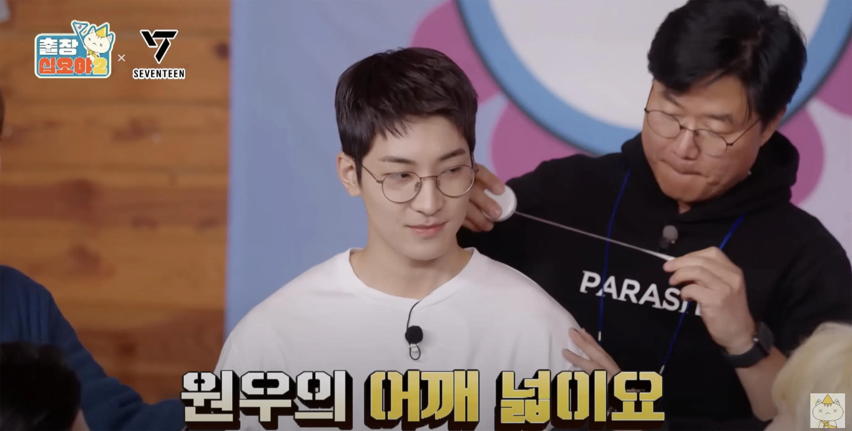 Seventeen member Wonwoo getting his shoulders measured by South Korean variety show producer Na Young-seok in a 2023 episode of the YouTube series The Game Caterers (2021 to present).