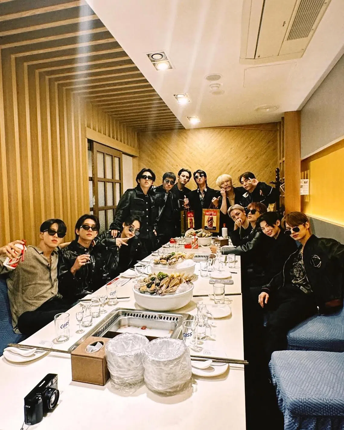 When Seventeen member The8 hosted the band’s monthly group meal in April 2023, he requested they dress like gangsters from hit Chinese crime series The Knockout (2023). The members are (from left) Hoshi, Joshua, Jeonghan, S.Coups, Wonwoo, Mingyu, The8, Dino, Seungkwan, Vernon, DK, Woozi and Jun.