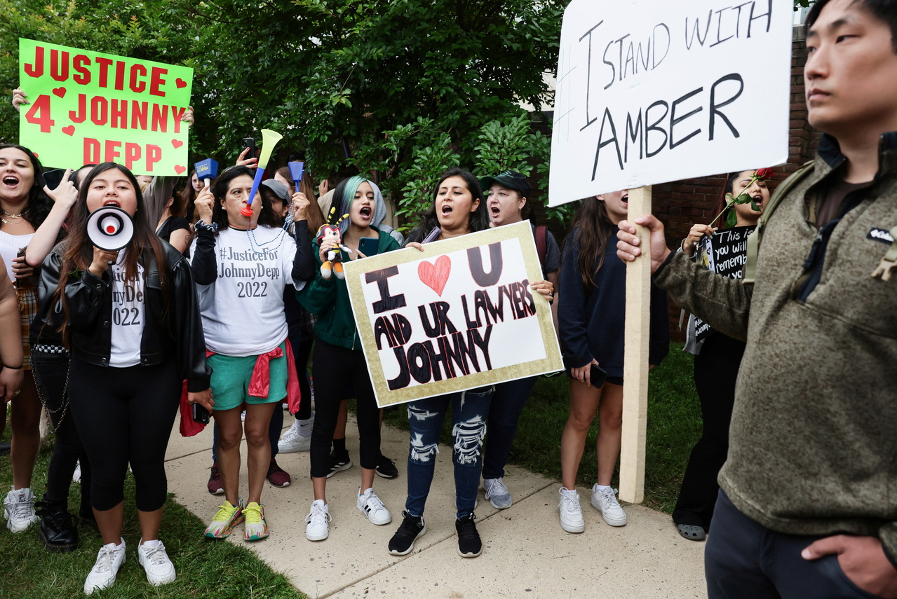 Fans of actor Johnny Depp react outside the courthouse to the verdict in his defamation case against ex-wife Amber Heard in Fairfax, Virginia, June 1, 2022.