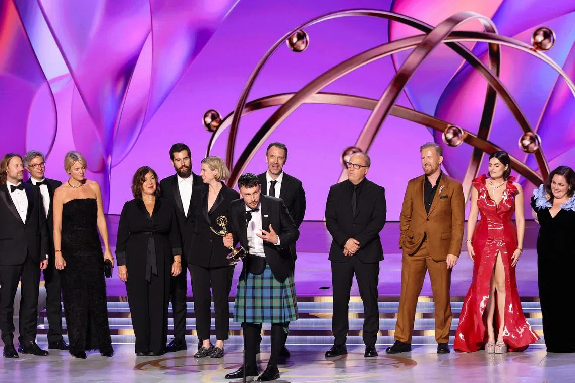 Richard Gadd, accompanied by cast and crew, receives the Best Outstanding Limited or Anthology Series award for Baby Reindeer at the 76th Primetime Emmy Awards in Los Angeles on Sept 15.