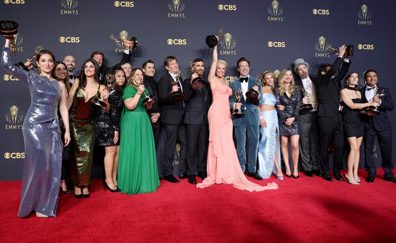 Cast and crew of "Ted Lasso" pose in the press room during the 73rd Primetime Emmy Awards at L.A. LIVE in Los Angeles, California, on Sept 19, 2021.