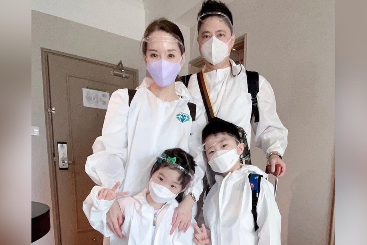 She posted a series of photos as they departed from Changi Airport last Friday (Oct 22), with the four of them in white protective suits, including visors for the face and masks.