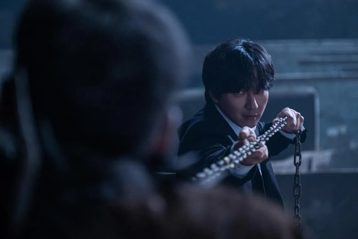 In his first scene, Cha is seen dressed in the traditional black cassock as he towers over a possessed woman on a bed and splashes holy water all over her.