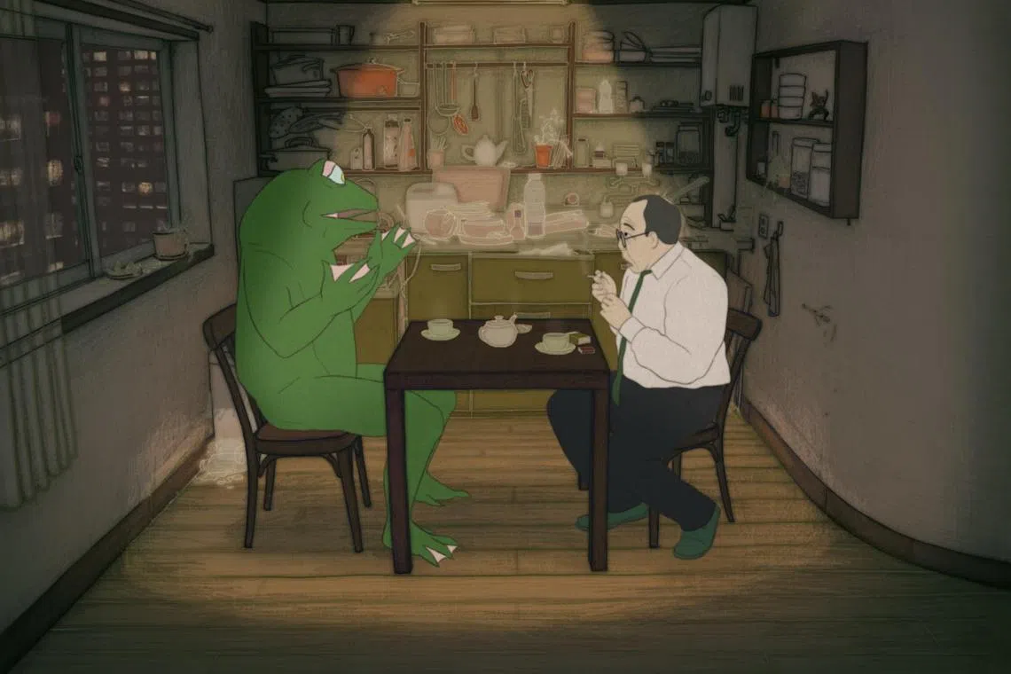 It is set just after the 2011 Great Sendai Earthquake. Two Tokyo salarymen are further destabilised when told their bank jobs will be outsourced. One is a timid debt collector who is visited that night by a talking frog seeking his help to save what is left of the city from a giant subterranean worm, and the other characters in this magic-realist animation are his colleague and the latter’s wife.