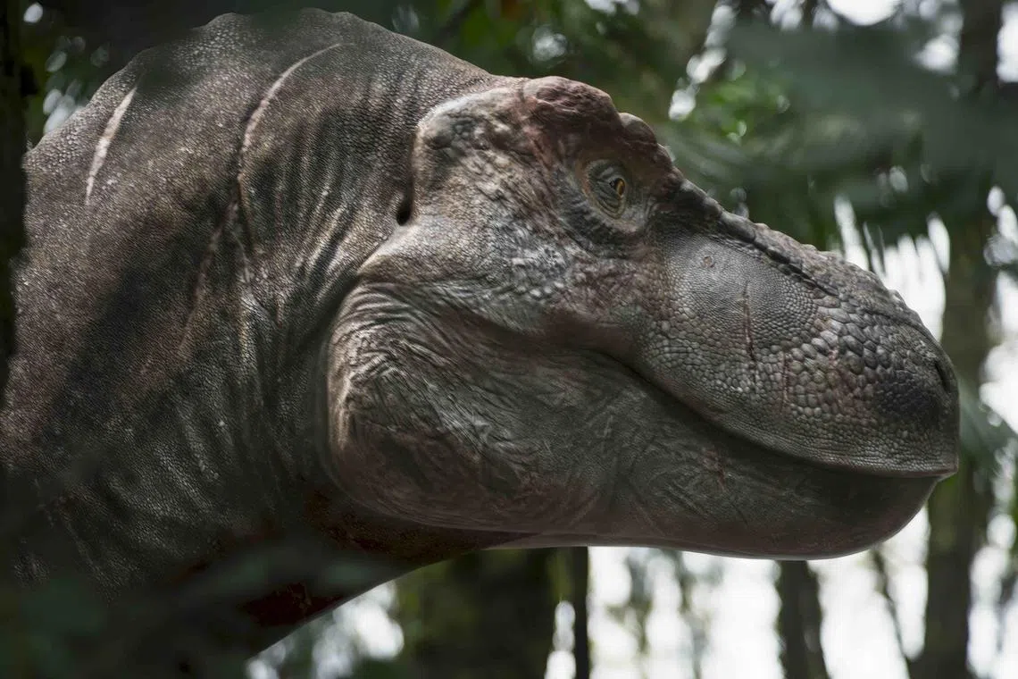 A close-up of a Tyrannosaurus rex as it emerges from the forest in the BBC series Walking With Dinosaurs.